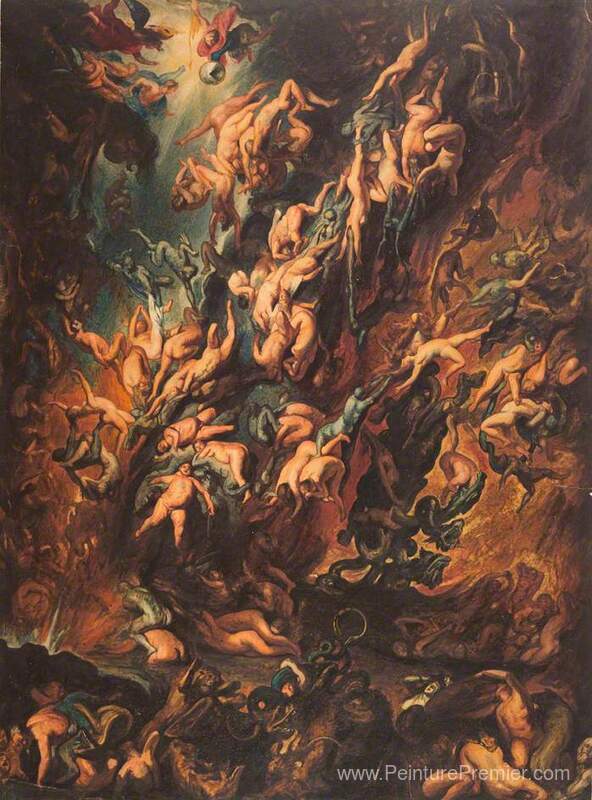 Nous vous proposons une reproduction artisanale sur toile du célèbre tableau 'La chute du damné (copie après Rubens)' de David Scott, provenant du Musée de la Reproduction.