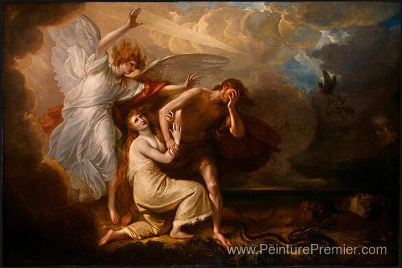 Nous vous proposons une reproduction artisanale sur toile du célèbre tableau 'L'expulsion d'Adam et Eve du paradis' de Benjamin West, provenant du Musée de la Reproduction.