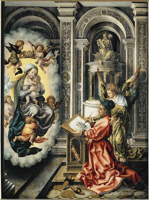 Nous vous proposons une reproduction artisanale sur toile du célèbre tableau 'Saint Luc peignant la vierge' de Mabuse, provenant du Musée de la Reproduction.