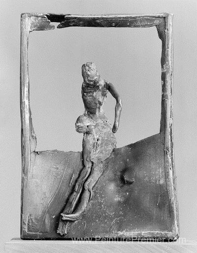 Nous vous proposons une reproduction artisanale sur toile du célèbre tableau 'Femme debout dans une boîte ouverte' de Nathan Oliveira, provenant du Musée de la Reproduction.