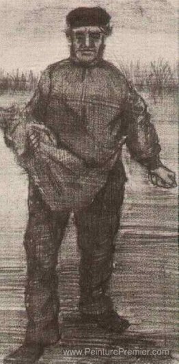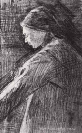 Femme, assise près du feu, épluche de pommes de terre, esquisse